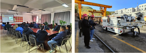 光力科技售后技術人員同客戶共同制定培訓計劃,展開數字化智能鉆機專項培訓。以“理論+實操”的授課方式,對ZYWL-6000Y數字化智能鉆機的運行原理,內部構造,鉆進、上卸鉆桿遙控系統控制等內容進行了全面展示和講解。通過 PPT模擬現場操作流程,對分解組裝設備時的注意事項、鉆進參數、設備運行參數的自動采集、安全預警及系統故障提示功能、遠程操作、設備維護保養知識等關鍵環節進行了深度解析。進一步對鉆機全自動、半自動控制及單步手動控制操作進行了示范演練,進一步強化培訓效果。目前數字化智能鉆機已正式投入井下使用。